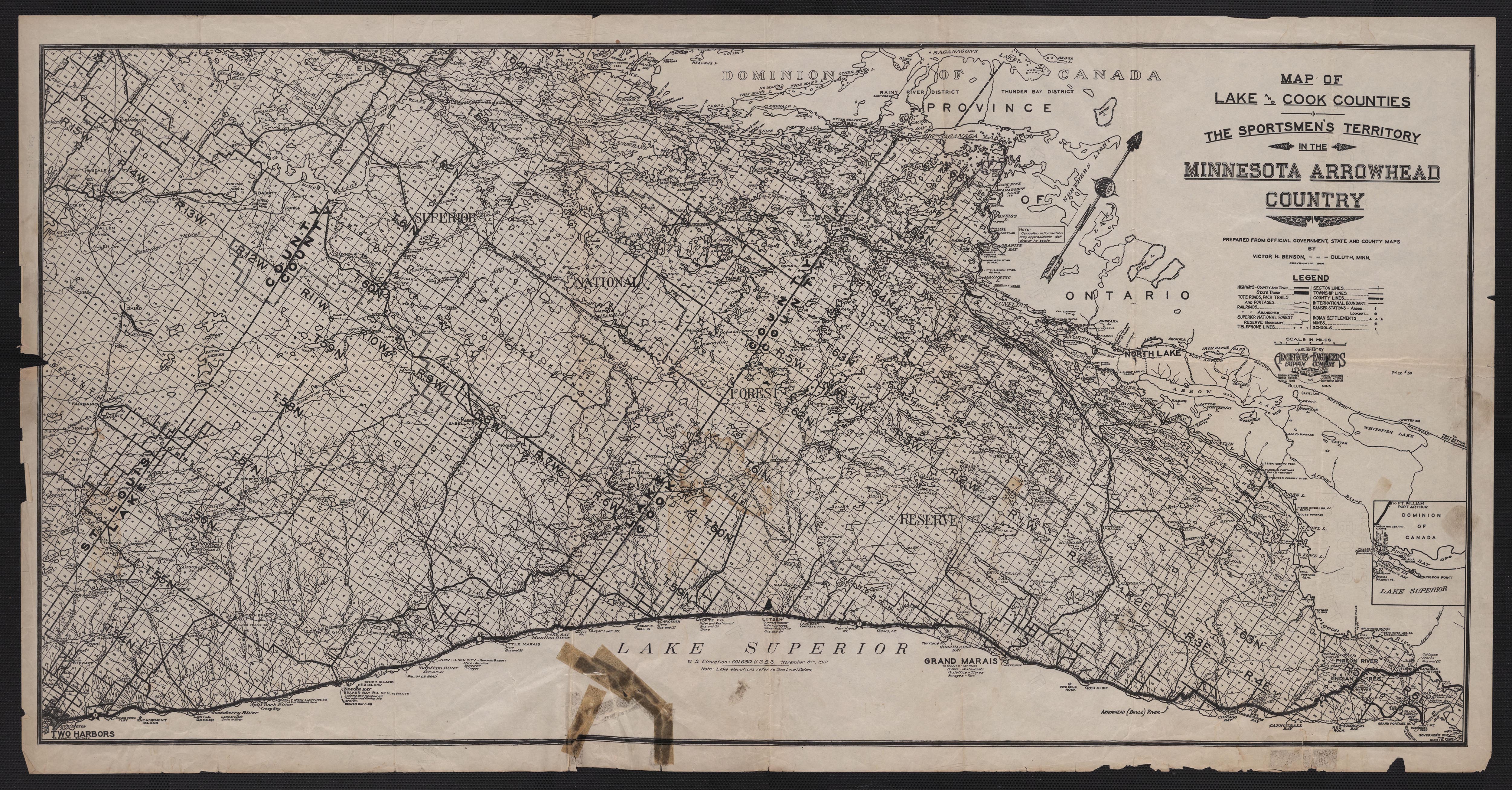 Benson, Victor H.. 1926. "Map of Lake and Cook counties in the Minnesota Arrowhead Country." Cook County Historical Society, Accessed January 5, 2026. https://collection.mndigital.org/catalog/p15160coll14:187