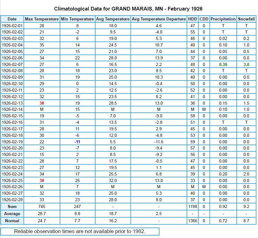 Climatological data from the Grand Marais, Minnesota weather station from February 1926. Weather data provided by NOAA Regional Climate Centers. Accessed January 1, 2026.